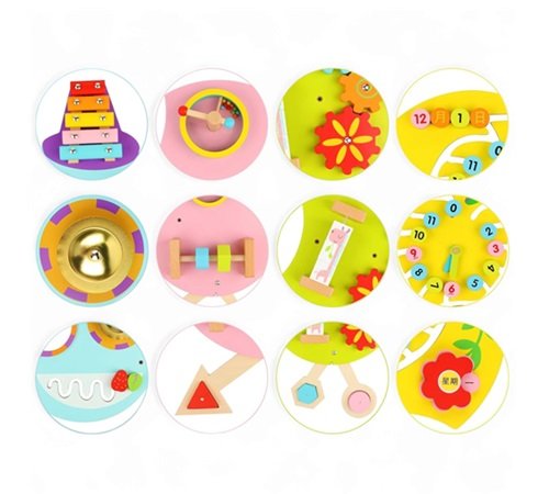 - 🌈 Potencia el desarrollo sensorial: colores vivos, texturas, sonidos del xilófono y espejos seguros.