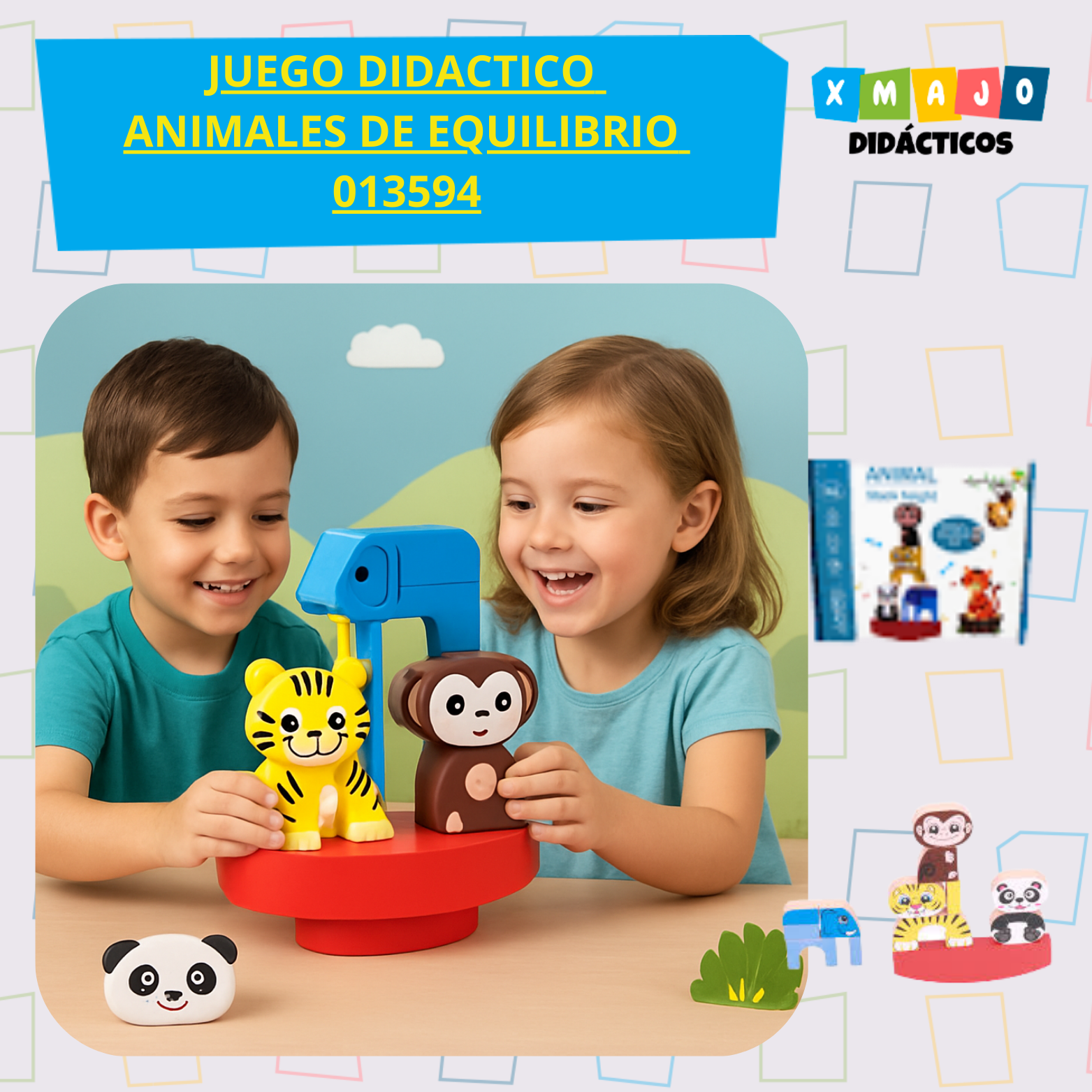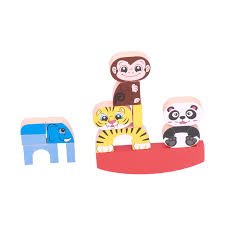 Incluye: Base roja balancín, 4 bloques animales (mono, tigre, panda, elefante) para apilar y equilibrar