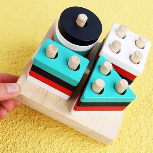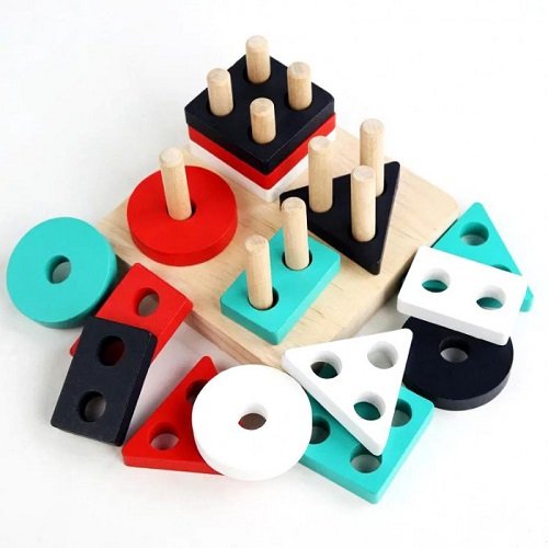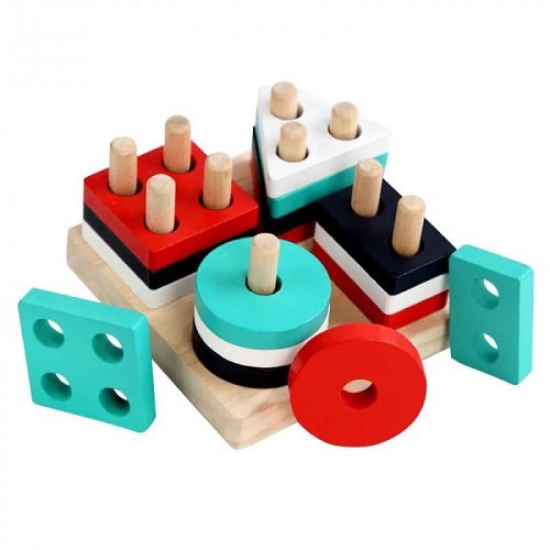 Este juguete de formas geométricas con clavijas de madera es perfecto para explorar y aprender jugando! 🌈🟥🟦🔺✨ Con bloques en colores vibrantes (rojo, negro, blanco, turquesa), formas como círculos, cuadrados, triángulos y rectángulos con agujeros para postes, invita a clasificar, apilar y encajar de forma autónoma. Ideal para introducir geometría básica de manera divertida y sensorial. 🧩🎨