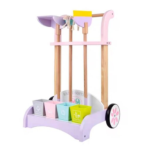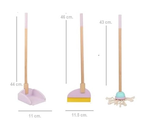Incluye: Carrito con ruedas reales, escoba, trapeador, recogedor, pala, 4 cubitos de reciclaje y ganchos para colgar