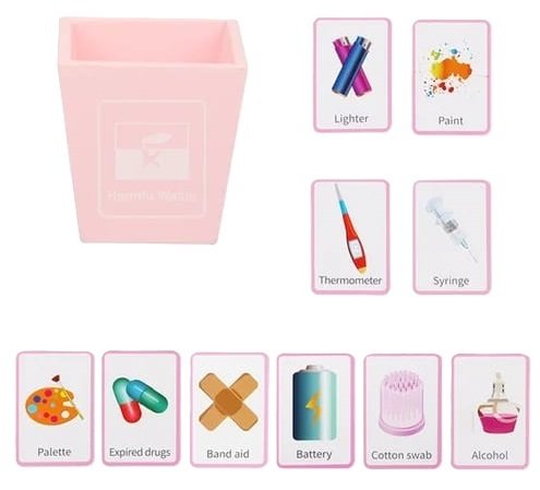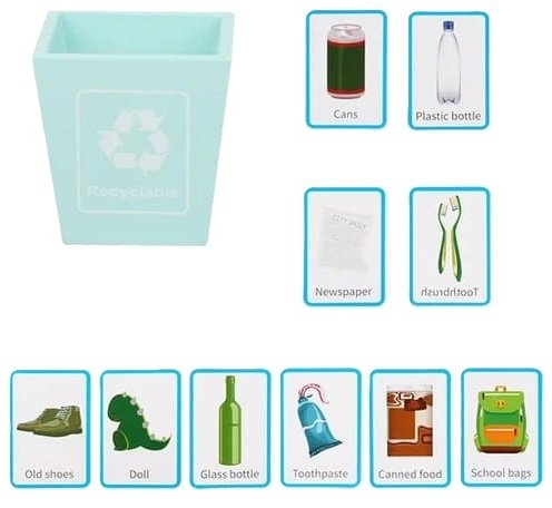 - Desarrolla el orden y la secuencia lógica: primero barre → recoge → clasifica en los cubitos de reciclaje. → Fuente: Montessori.edu – “Practical Life Exercises”