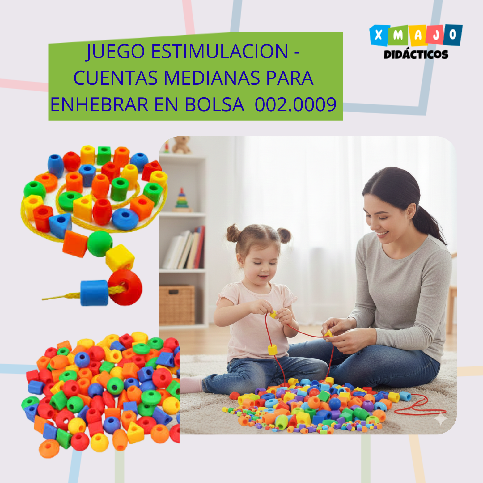 Lleva la destreza de tu pequeño al siguiente nivel con nuestro set de cuentas medianas. Este material está diseñado para perfeccionar el control motor y la discriminación visual a través de formas, colores y texturas que desafían la coordinación de una manera divertida y gratificante.