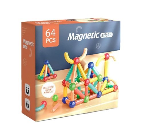El juego viene en dos presentaciones de 34 o 64 piezas. Las piezas tienen extremos imantados, son de colores vivos y fáciles de manipular.